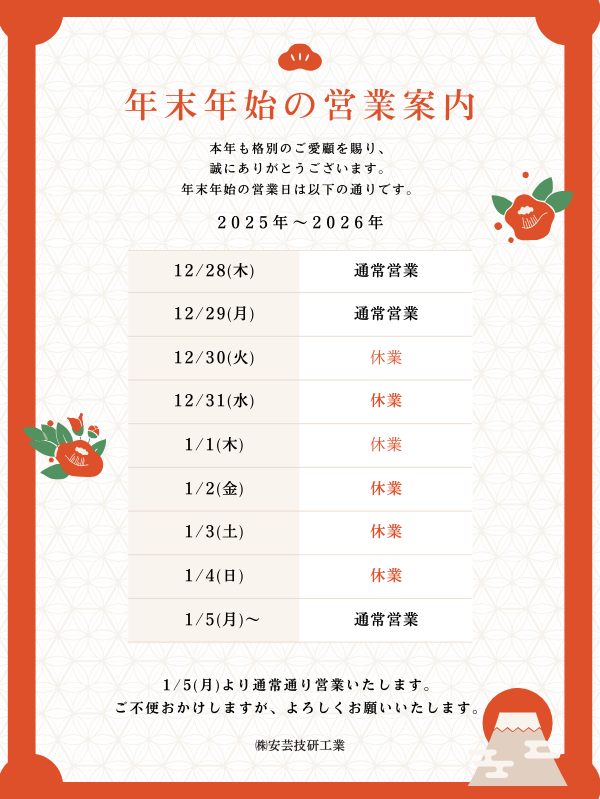 年末年始営業のお知らせ